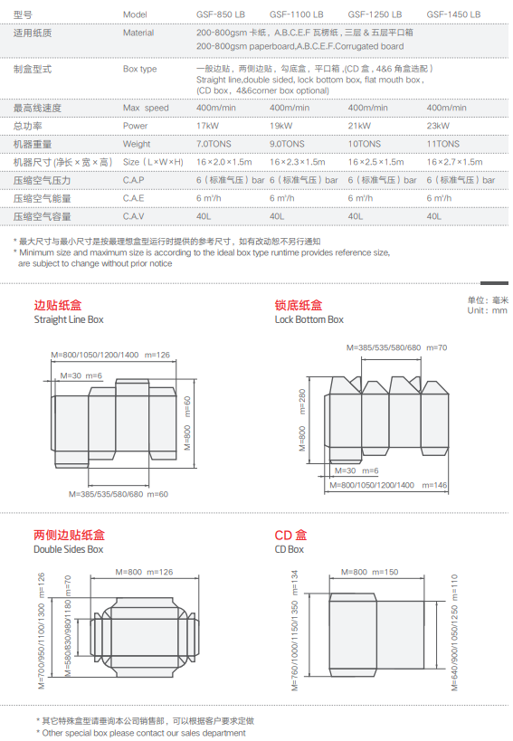 GSF-850/1100 LB卡紙 · 瓦楞鎖底糊盒機技術參數及制作尺寸:
